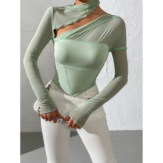 Europe And America's New Slim-Fitting T-shirt Women's Mesh Splicing Hollow