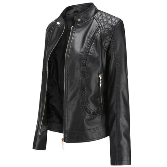 Stand-up collar PU leather jacket women