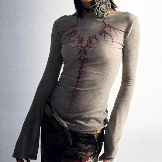 Spring New Elegant Women's Printed Round Neck, Slim-fit, Long-sleeved Top