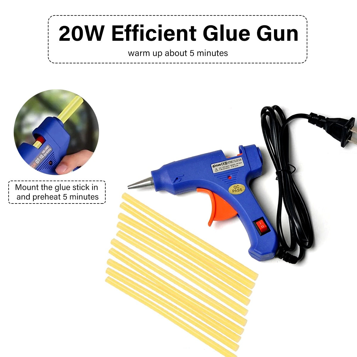 2. Mount the glue stick into the glue gun,pull the trigger to let the glue stick enter into the glue gun, connect the power source and preheat for 5 minutes;