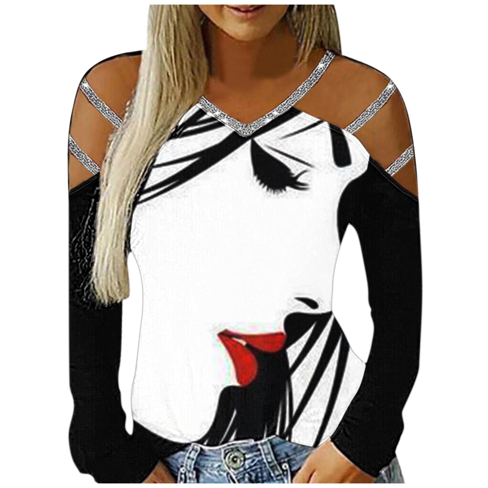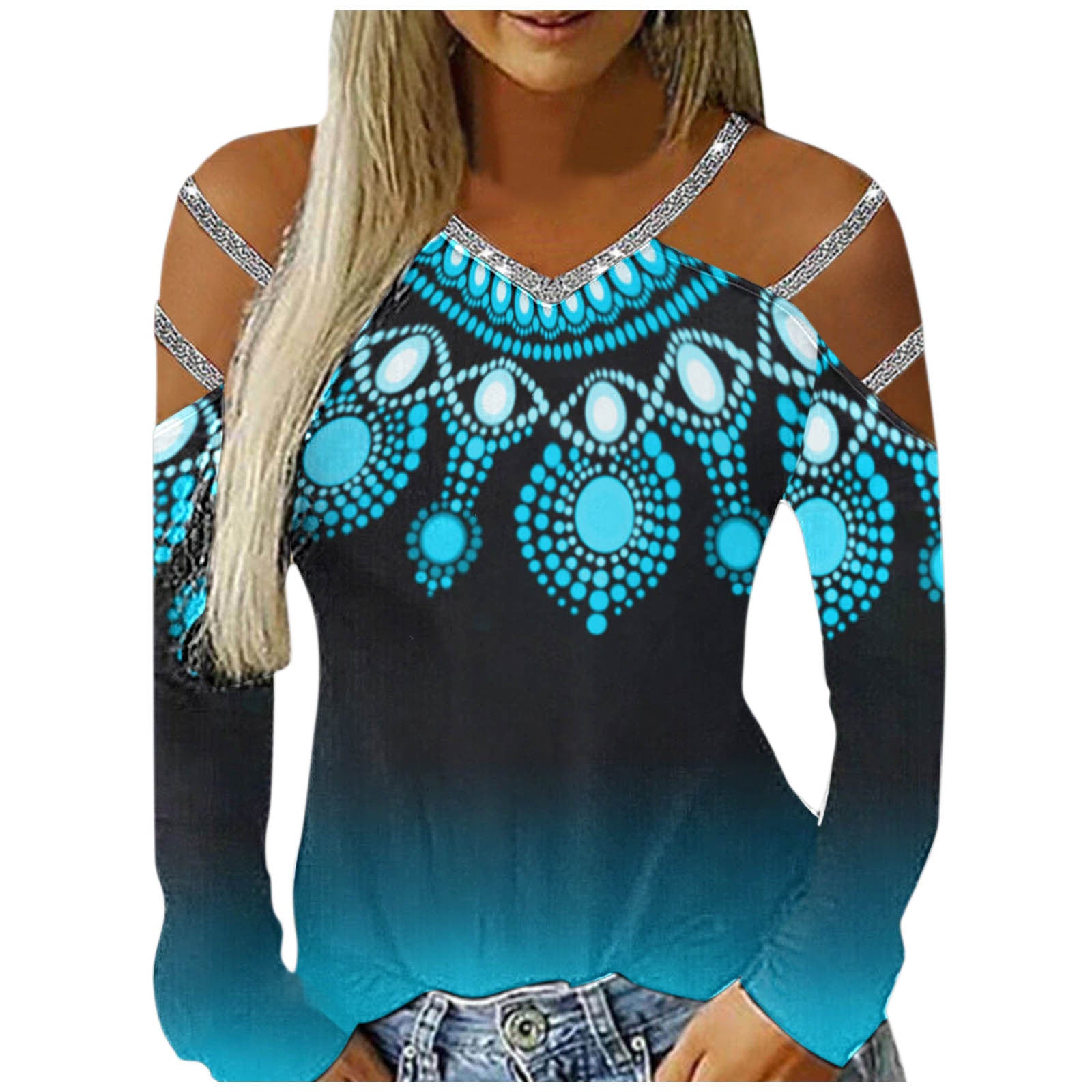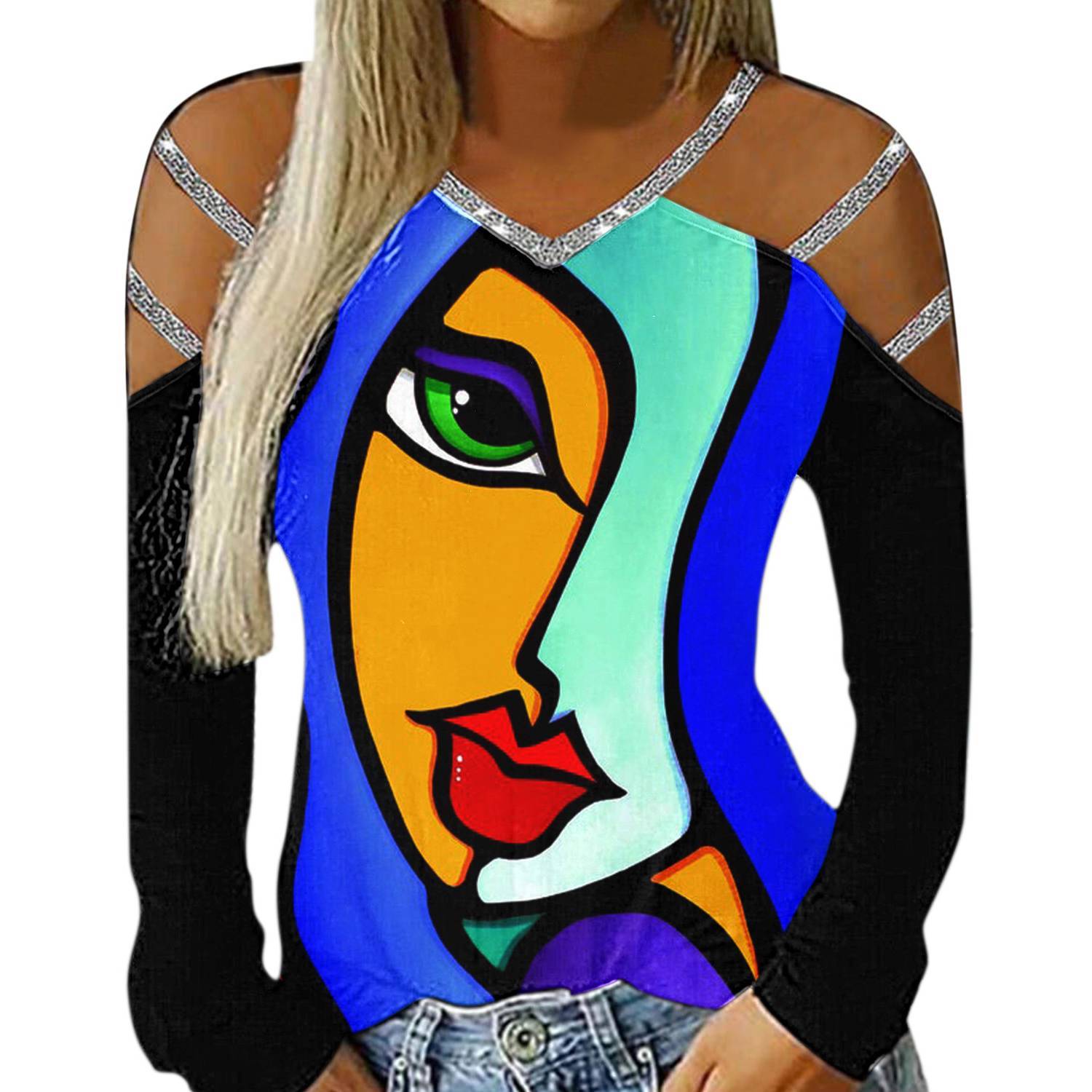Ladies Casual V-Neck Printed Cutout Off Shoulder Long Sleeve T-Shirt