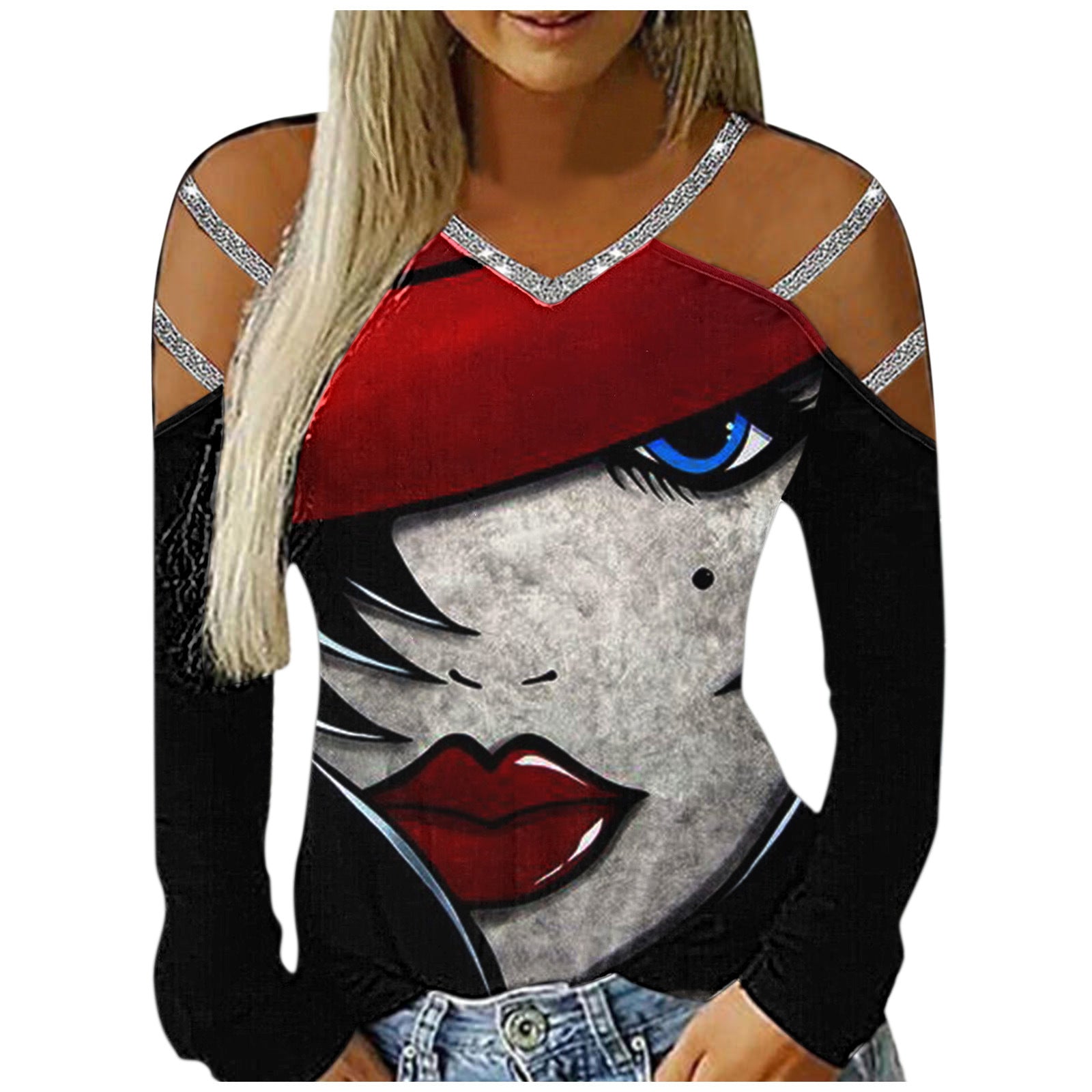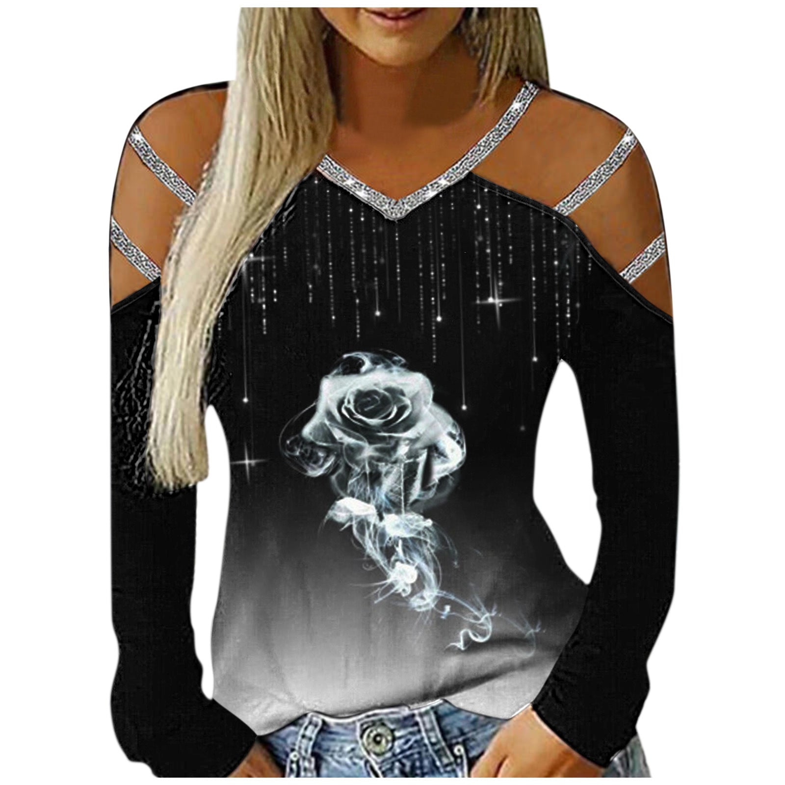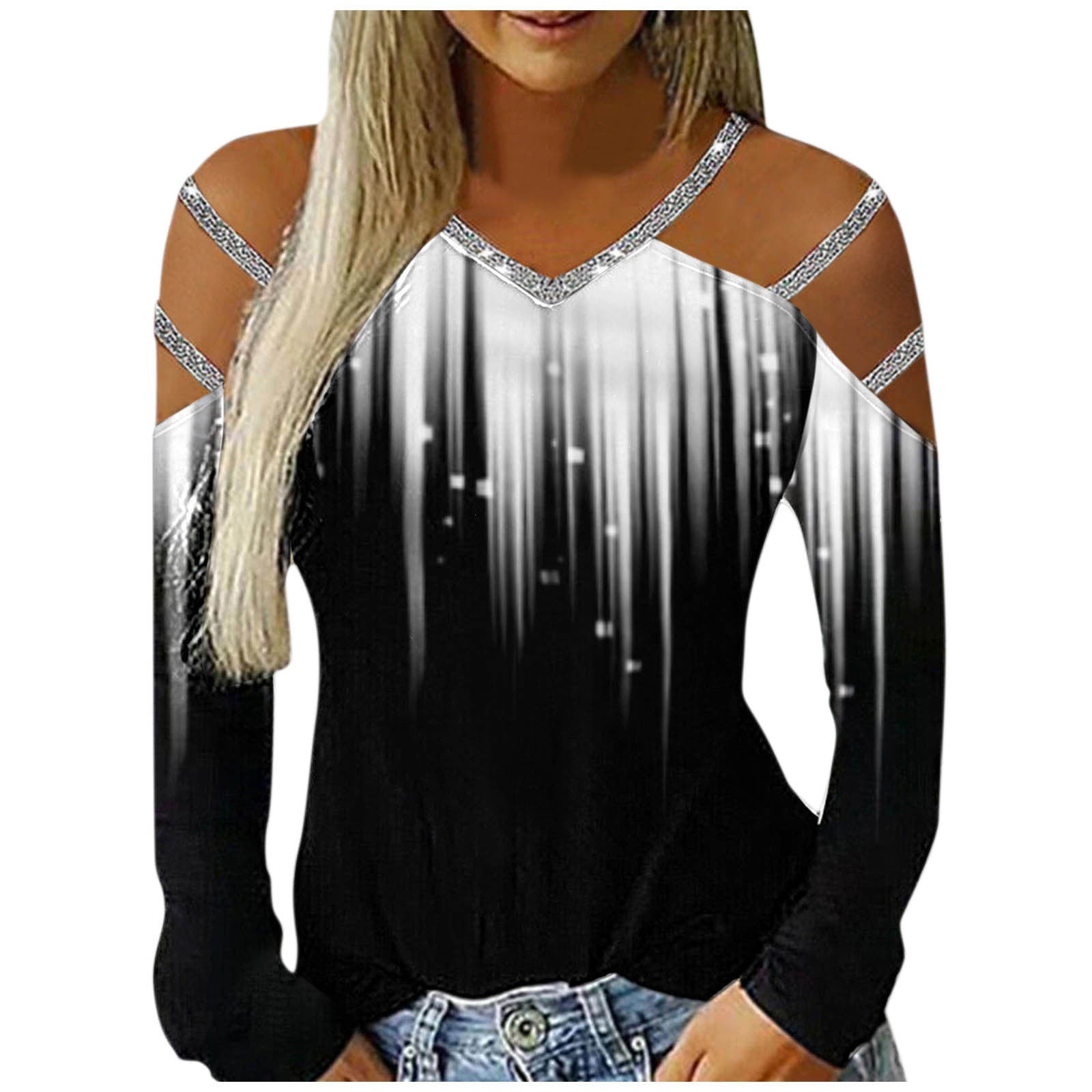 Ladies Casual V-Neck Printed Cutout Off Shoulder Long Sleeve T-Shirt