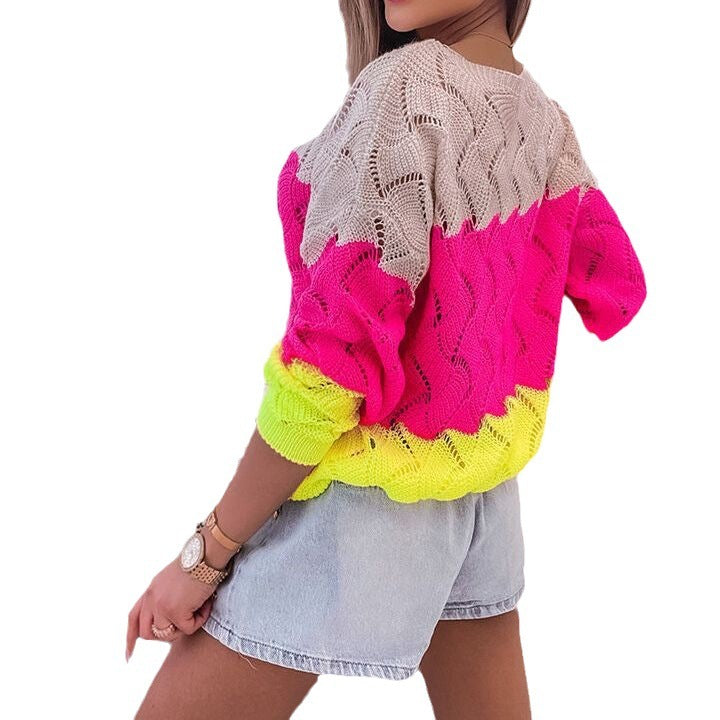 Off-neck Three-color Stitching Wave Long Sleeve Women's Sweater