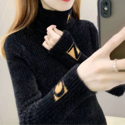 Women's Turtleneck Sweater Mink Fur Letter Jacquard